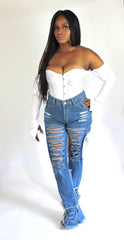 Stop the show with our glammed out Duchess Blouse. The fit of this corset style  blouse can be adjusted with the back lace tie. The tighter you tie the smaller your waist will appear. Pair the blouse with our Hot Gurl Denim to complete the look.