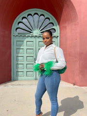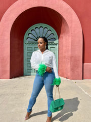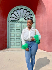 White button up collared blouse with Kelly Green Ostrich Feather Cuffs (removable).