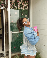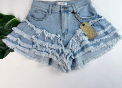 Add some fun into your wardrobe with our “Lizzie Ruffle Shorts”. A shop favorite, these light blue denim shorts are perfect for a casual night on the town. We love them paired with over-sized sweaters or even Bodysuits!