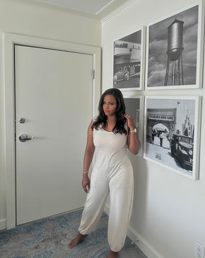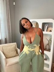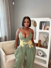 Olive green Jumpsuit with tie-dye middle. Complements the waist. The wide legs give an hour glass allusion. Zipper back. Comfortable fit. Adjustable straps.